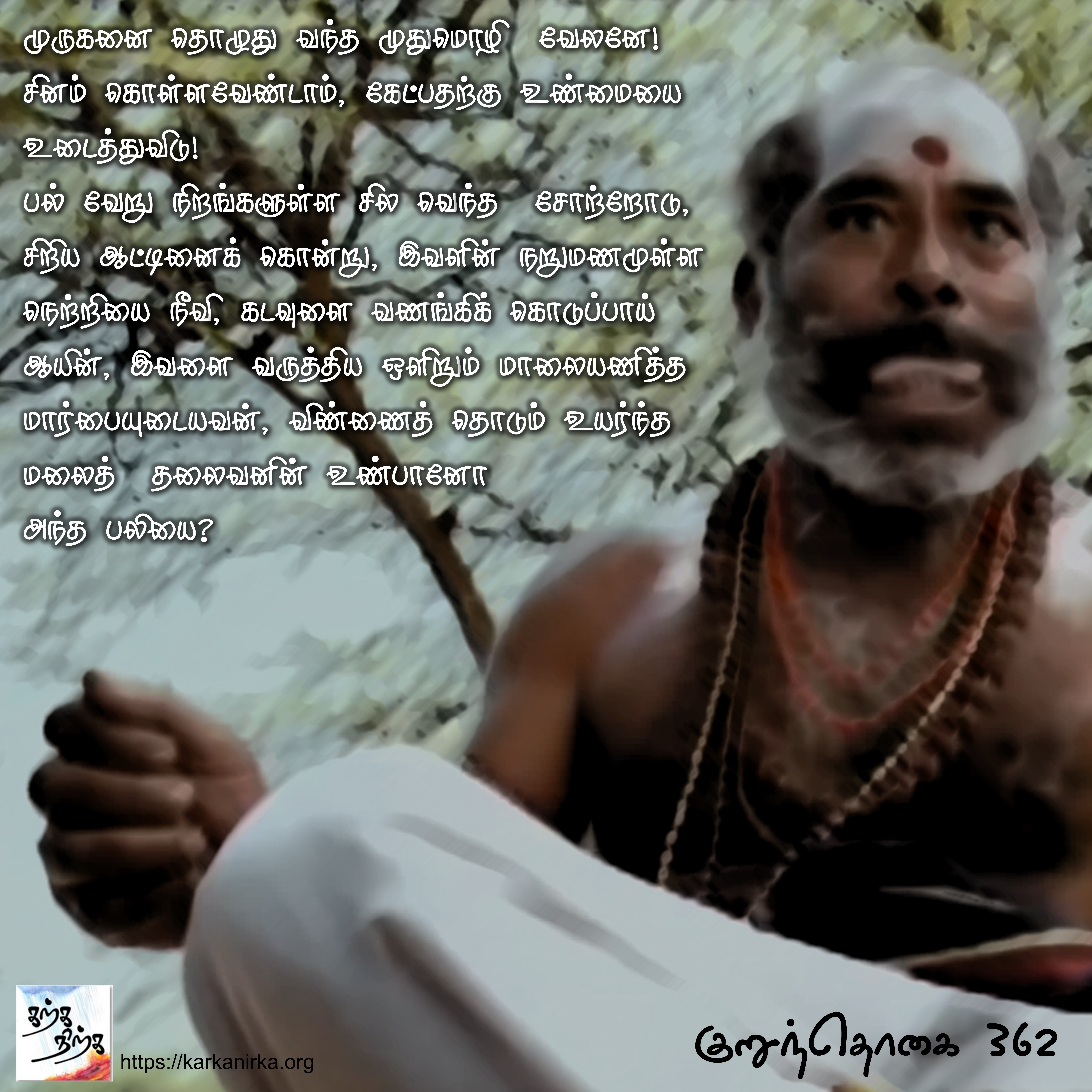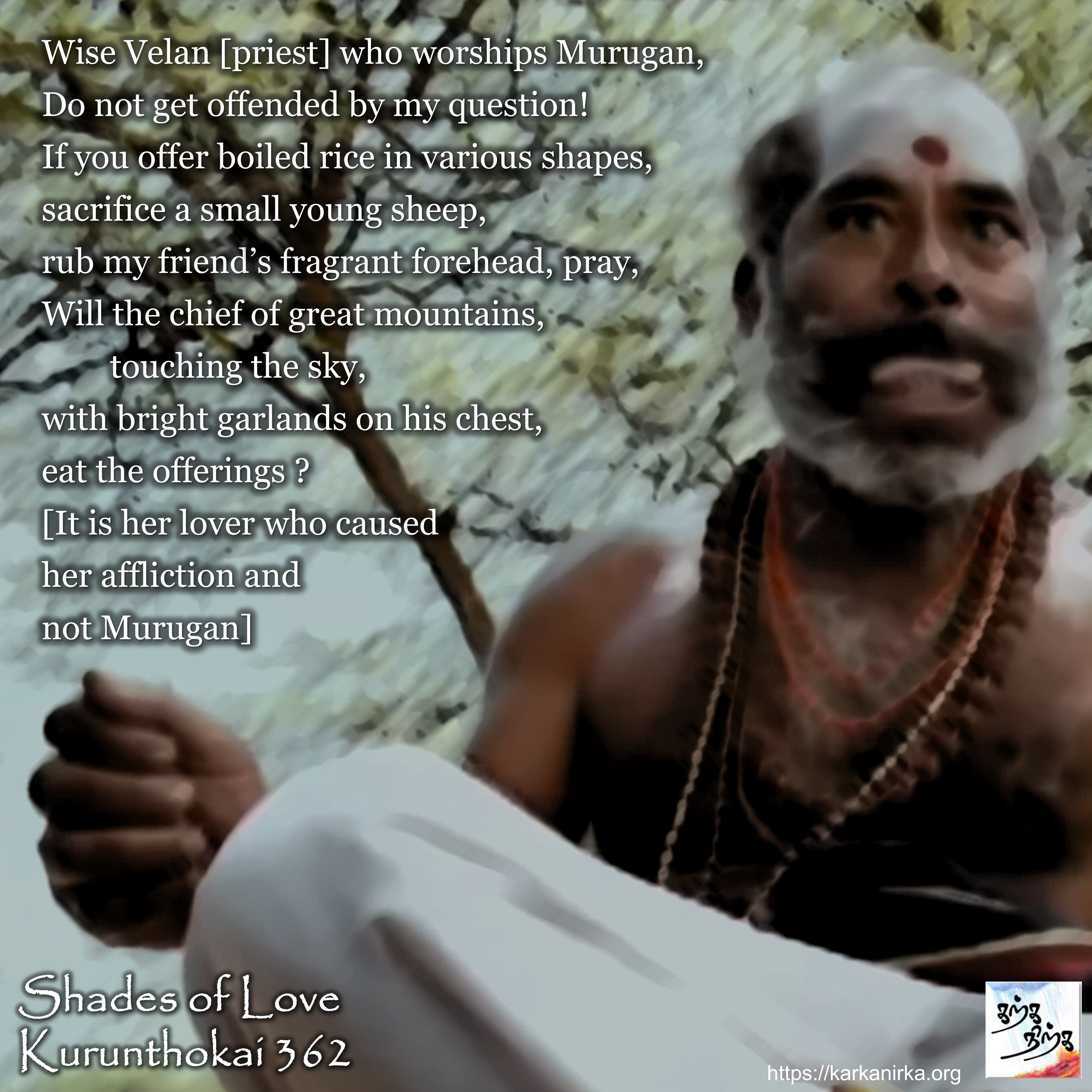 Kurunthokai 362, Vēmpatrūr Kannan Koothanār, Kurinji Thinai – What the heroine’s friend said to the Murukan priest, as the foster mother listened