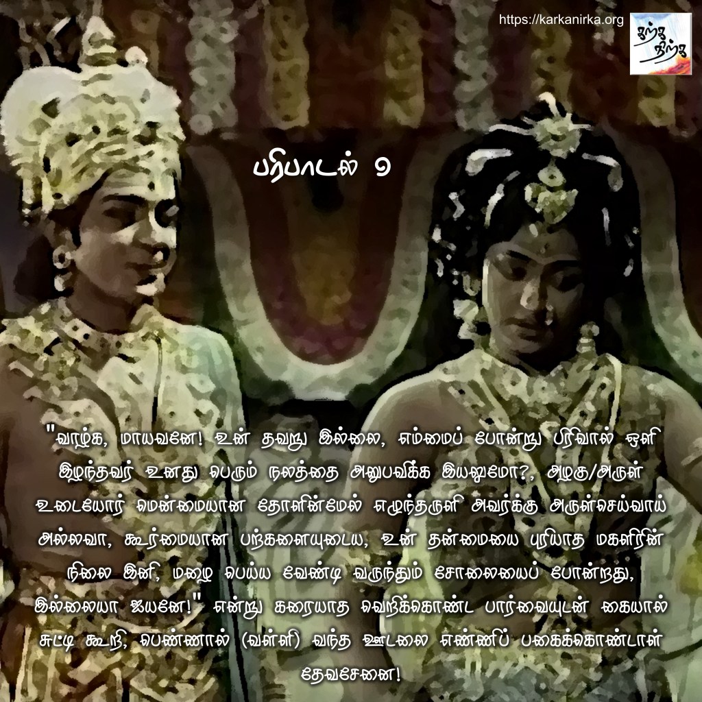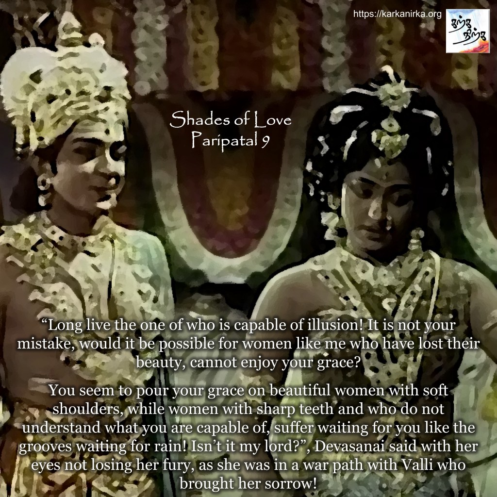 You seem to pour your grace on beautiful women with soft shoulders, while women with sharp teeth and who do not understand what you are capable of, suffer waiting for you like the grooves waiting for rain! Isn’t it my lord?”, Devasanai said with her eyes not losing her fury, as she was in a war path with Valli who brought her sorrow. the man with lance (Murugan) immediately payed his tribute by bowing his head in such a way that his head wreath touched her perfect feet.
