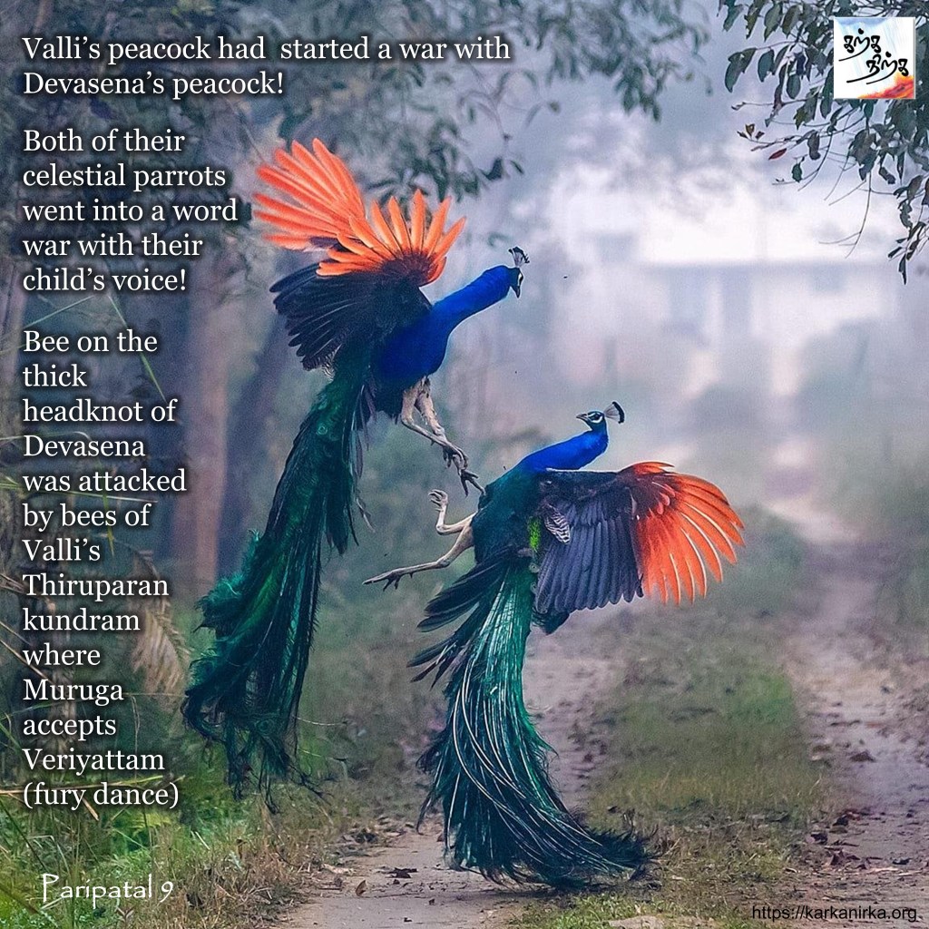Bee on the thick headknot of Devasena was attacked by bees of Valli’s Thiruparankundram where Muruga accepts Veriyattam (fury dance)