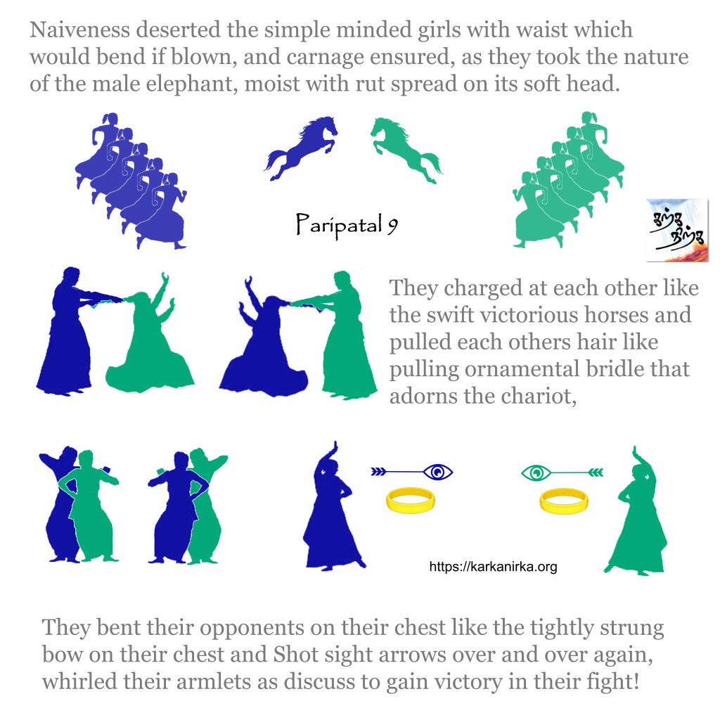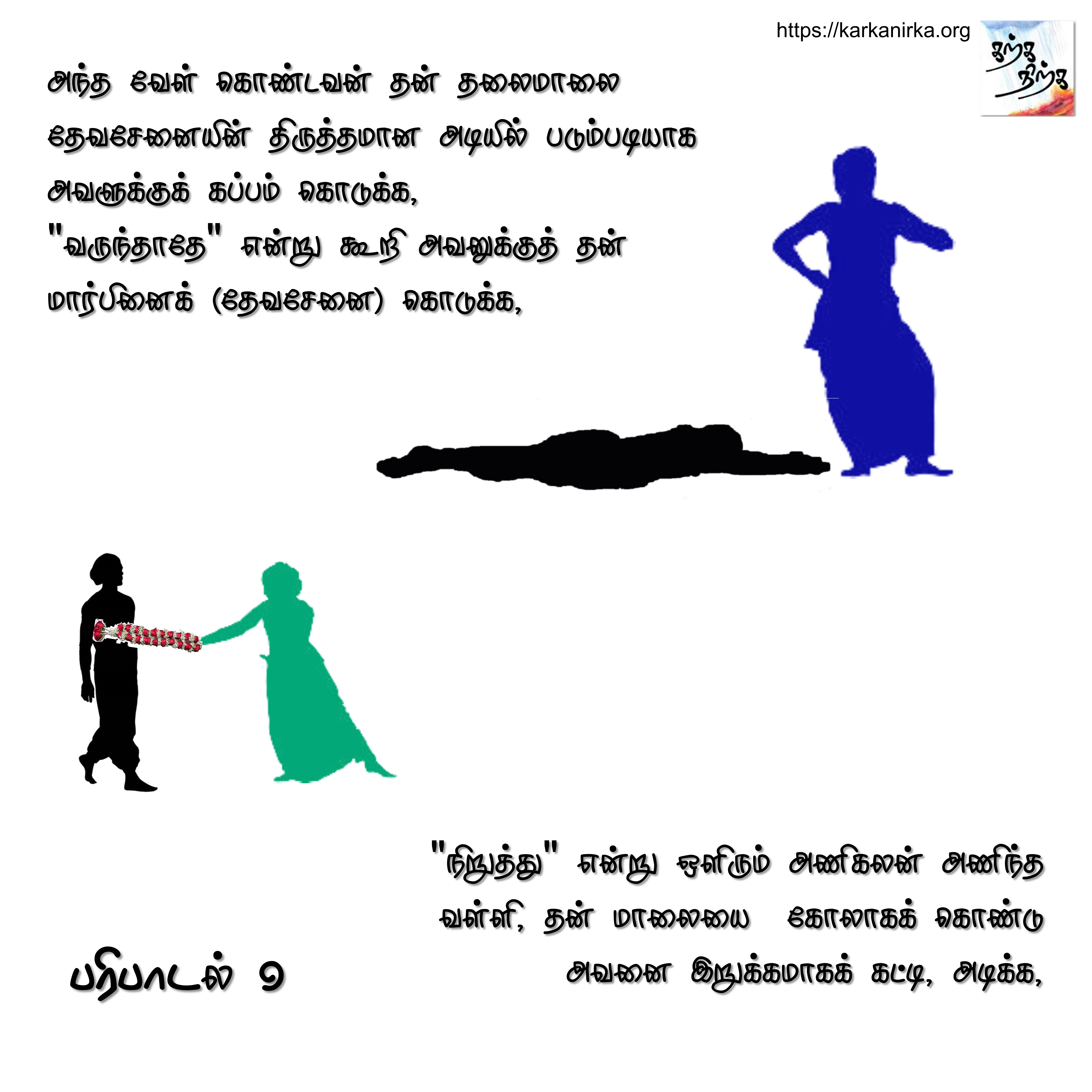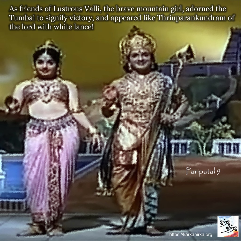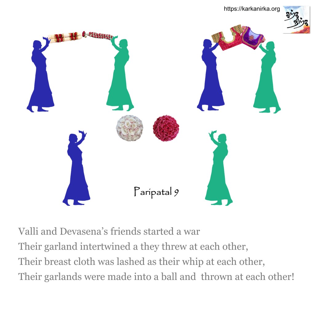 “Cease, move no more” , said Valli who adorned bright ornaments. She clasped Murugan tighter and tighter, took her garland and used it as a rod to beat him!